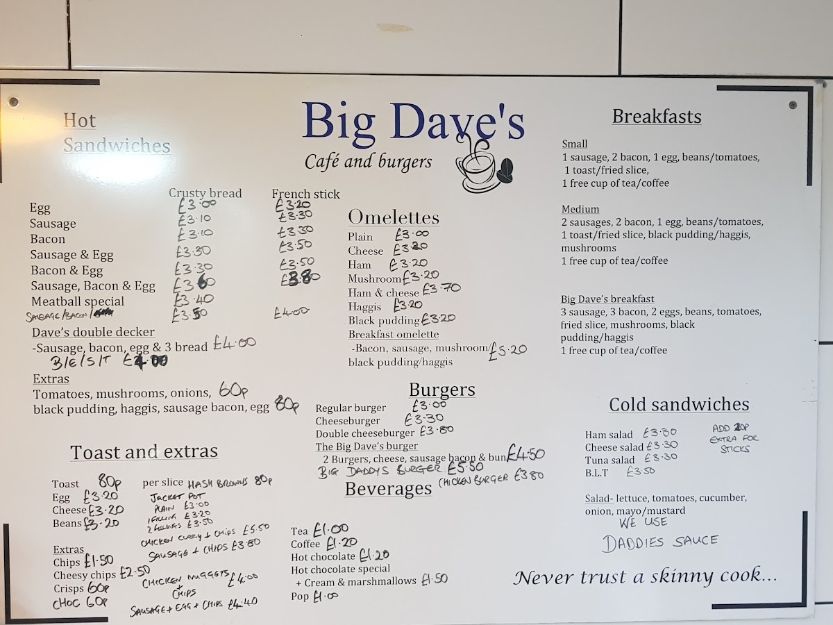 The menu at Big Dave's Cafe offers a straightforward and comforting selection, perfect for those seeking a casual breakfast or a relaxed meal throughout the day. Expect simple café-style dishes and familiar favourites, with a focus on hearty, satisfying plates and warm drinks that complement the welcoming atmosphere.